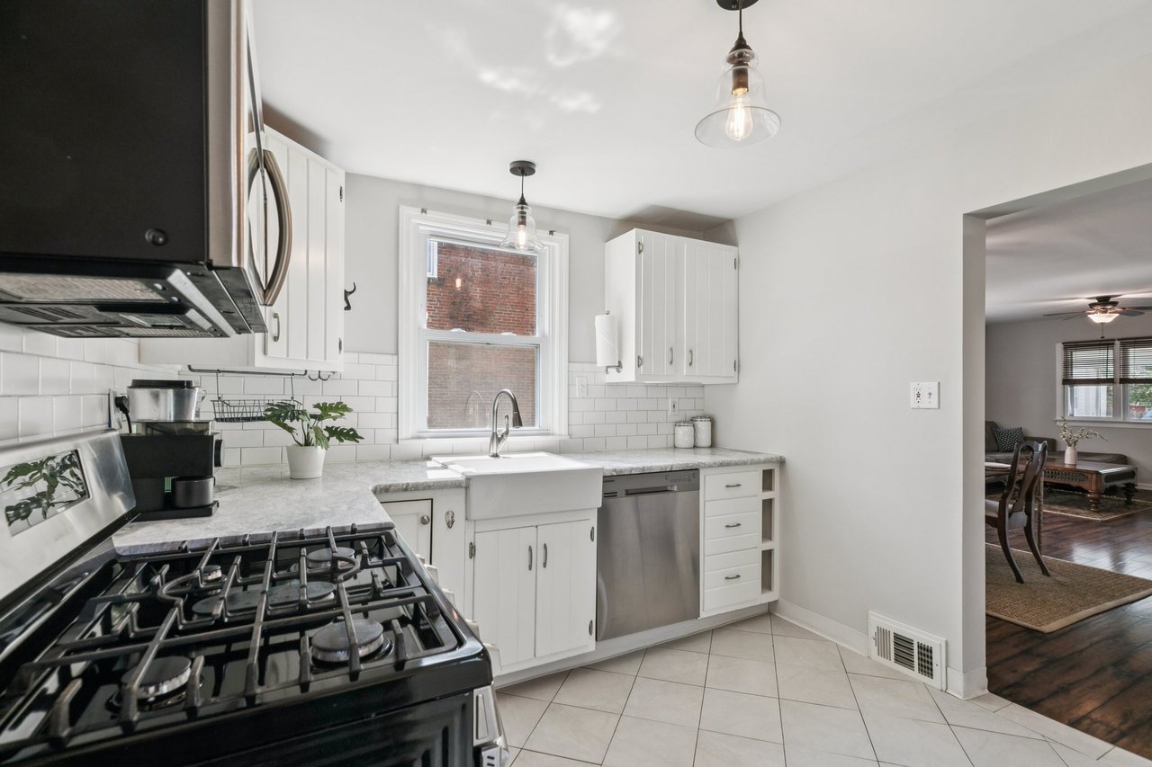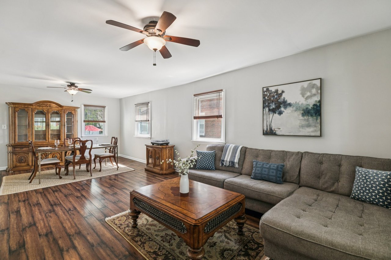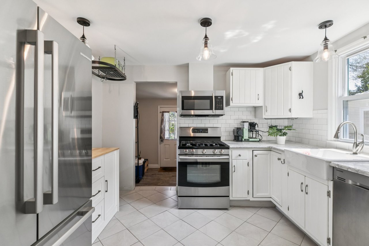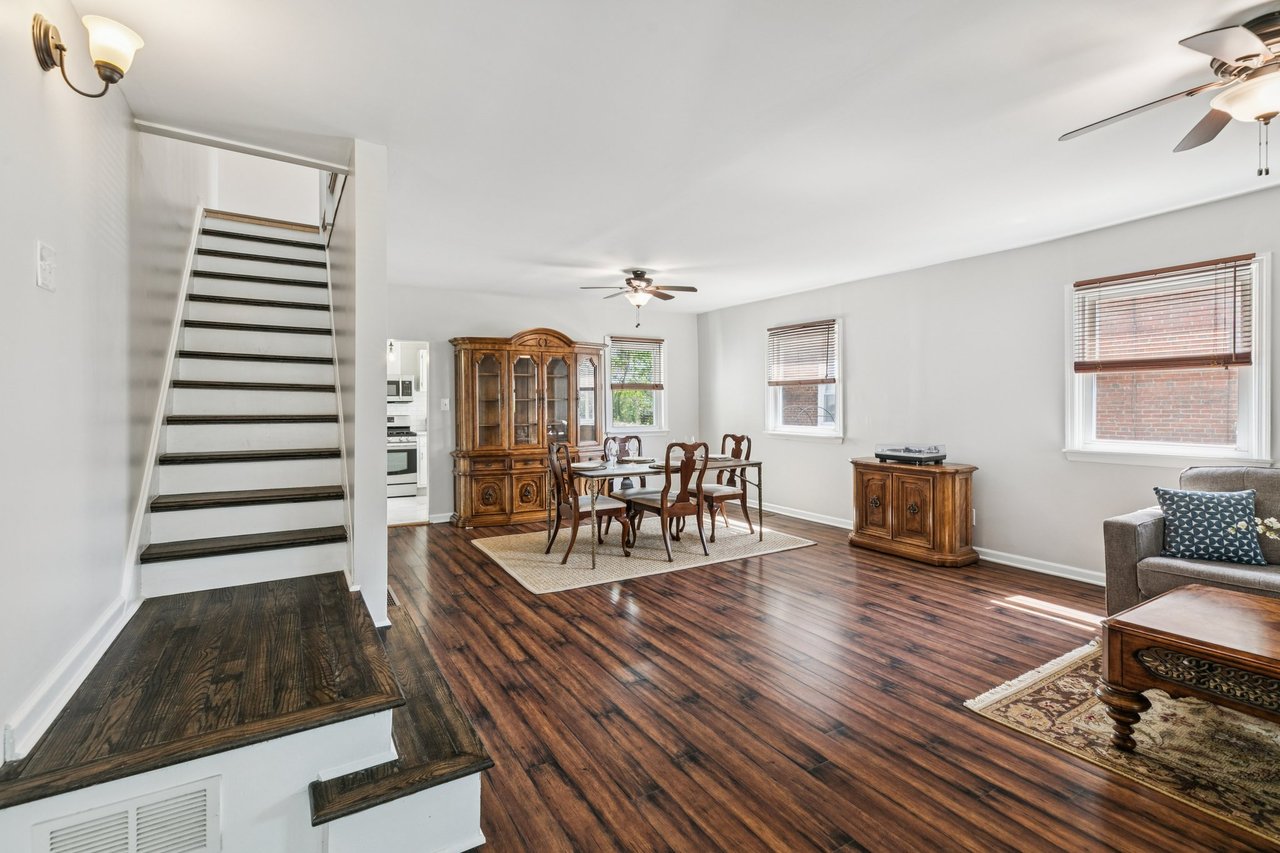 Step inside through the recently refinished enclosed front porch, a welcoming spot to start your day with a cup of coffee or unwind in the evening. The main level features a spacious, open living and dining area with a comfortable flow, ideal for both everyday living and hosting guests.The kitchen is thoughtfully updated with a new refrigerator, stainless steel appliances, white shaker cabinetry, and a tile backsplash, and is complemented by a generously sized mudroom with access to the backyard.