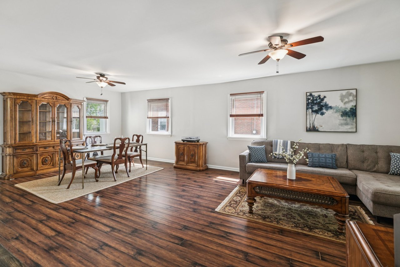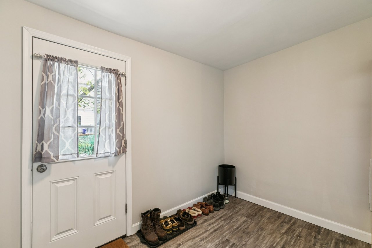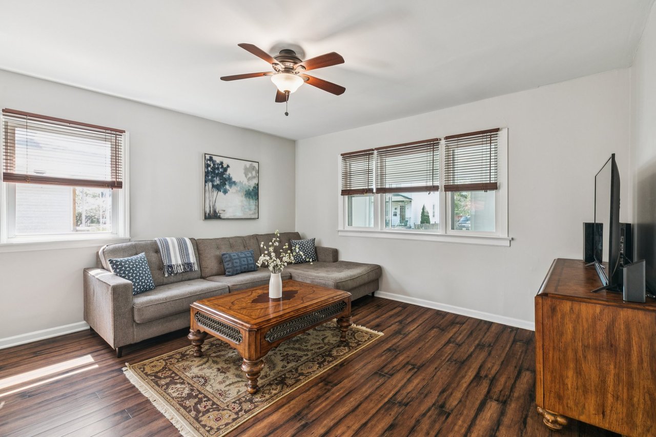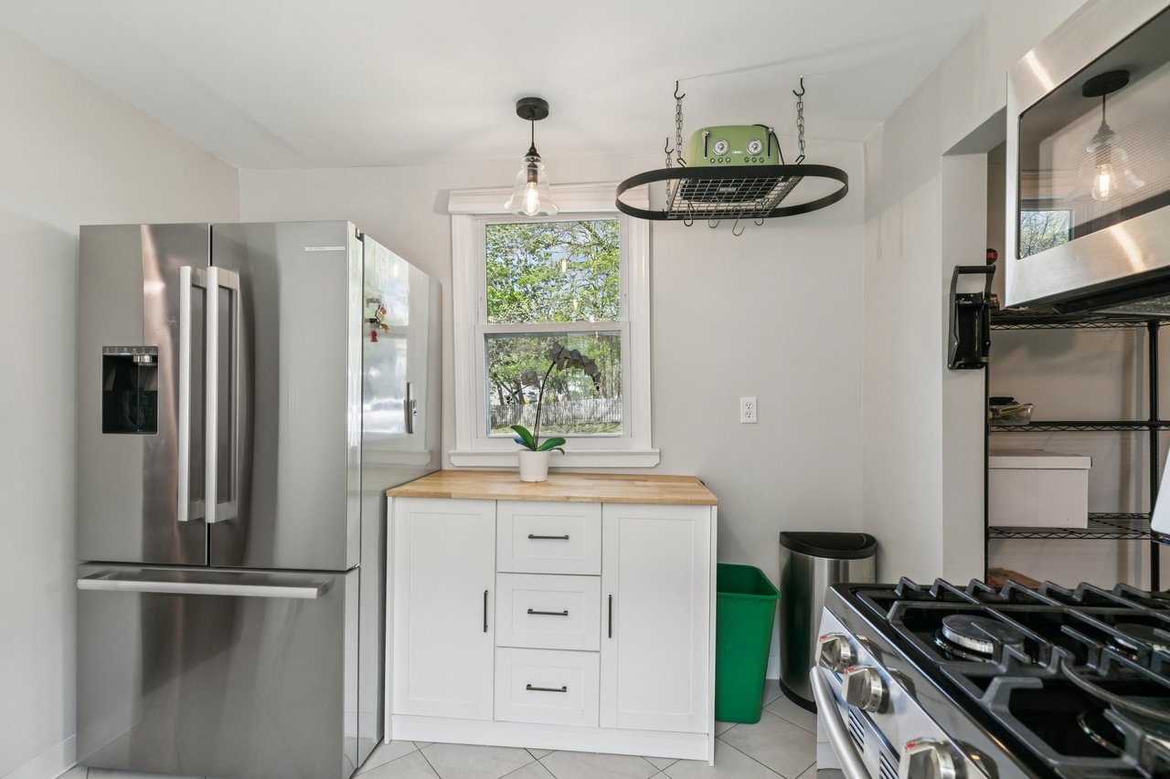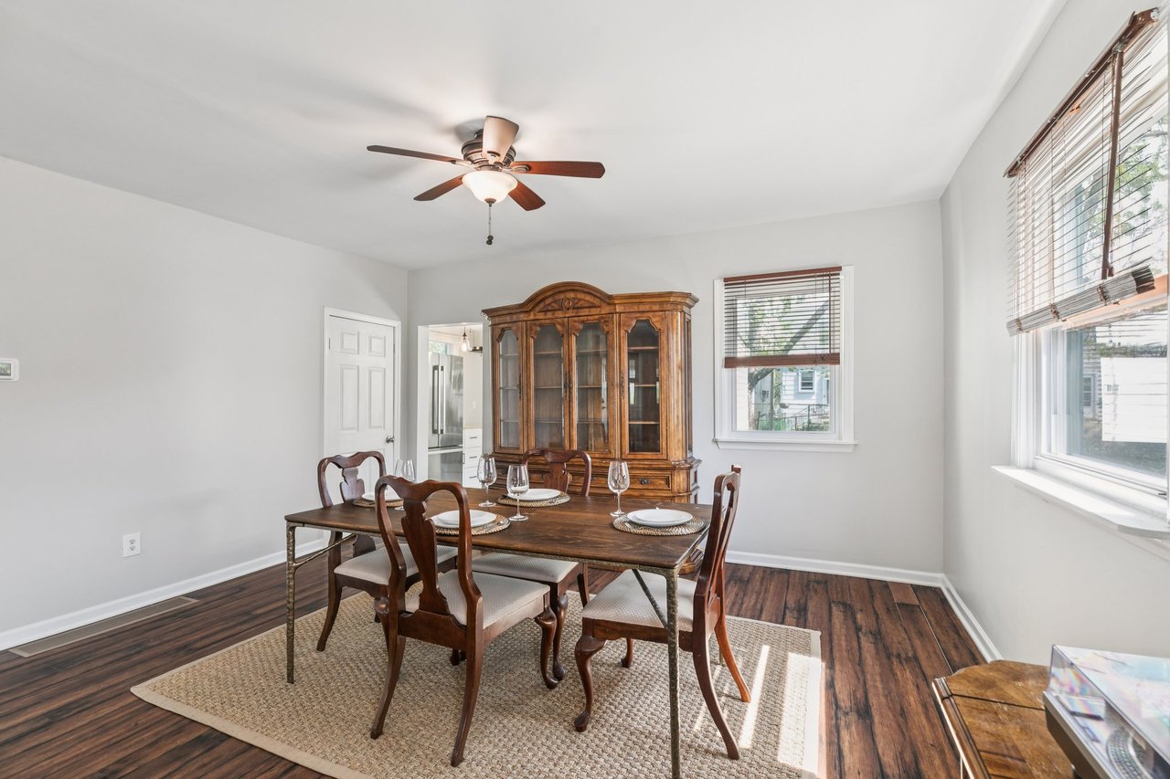 Step inside through the recently refinished enclosed front porch, a welcoming spot to start your day with a cup of coffee or unwind in the evening. The main level features a spacious, open living and dining area with a comfortable flow, ideal for both everyday living and hosting guests.The kitchen is thoughtfully updated with a new refrigerator, stainless steel appliances, white shaker cabinetry, and a tile backsplash, and is complemented by a generously sized mudroom with access to the backyard.