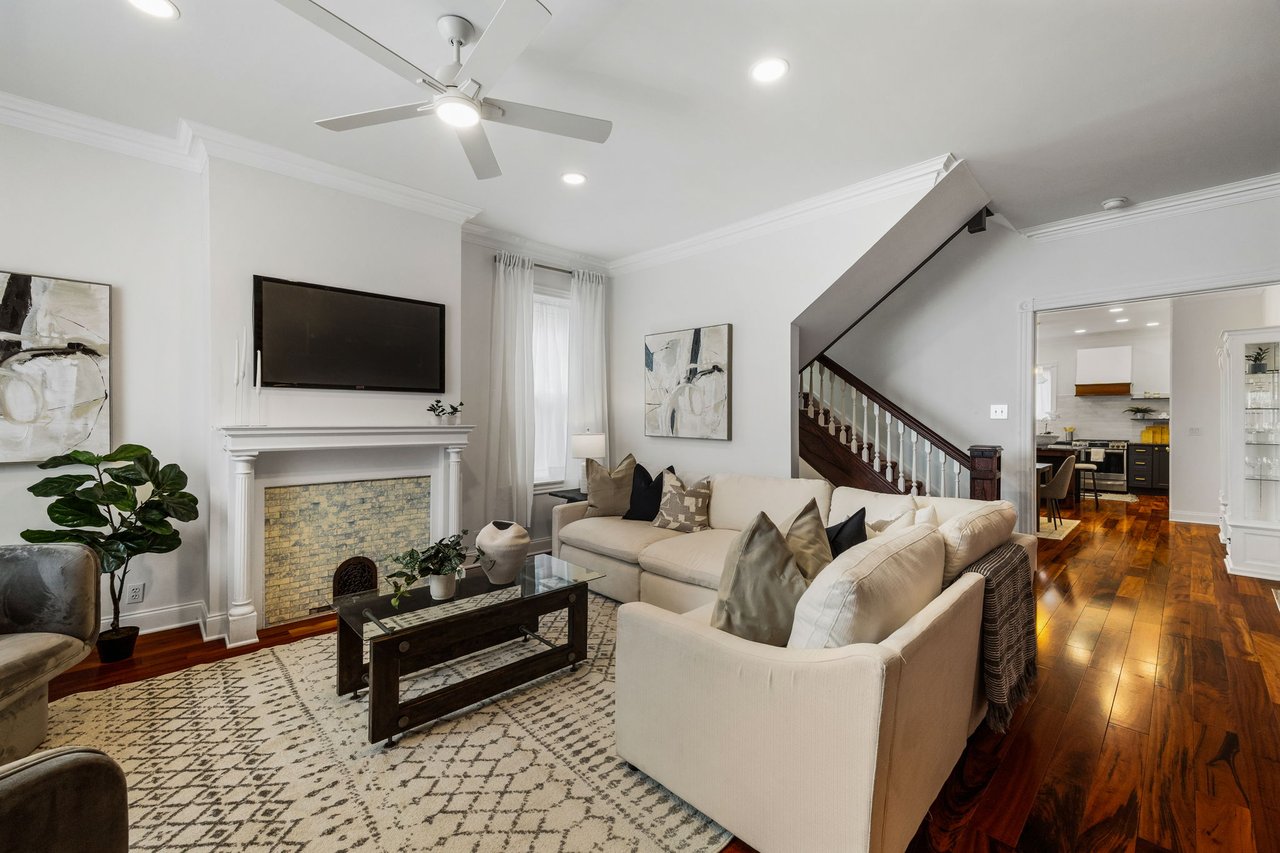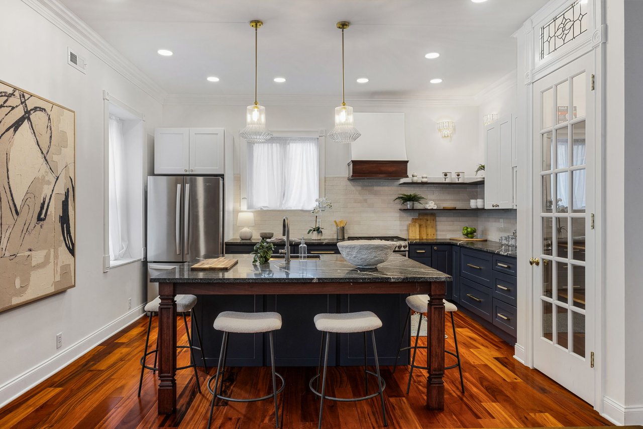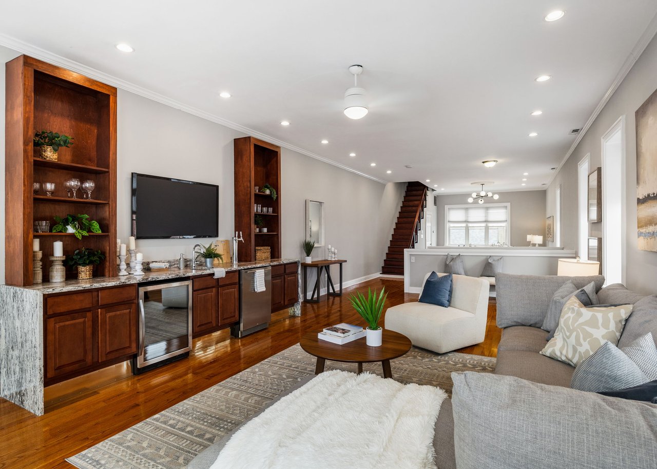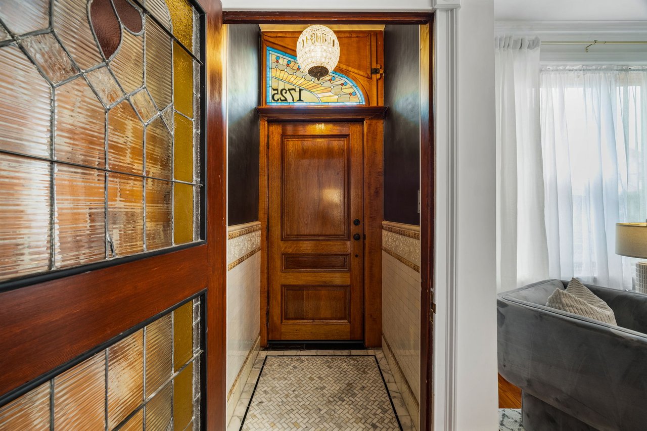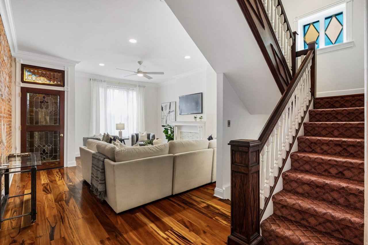 You’ll believe in love at first sight when you walk through the mahogany front door of this truly stunning, one-of-a kind home that combines historical charm with modern amenities. Step inside the ornately-tiled entryway with original stained glass door & transom to a gorgeous living room with 10’ high ceilings, hardwood floors, crown molding, a decorative mantle, and exposed brick wall. Continue to the spacious dining room with built-ins, open to the recently-renovated chef’s kitchen including two-tone cabinetry, granite countertops, a chic tile backsplash, and a glass door pantry. Head up the freshly carpeted stairs, past an original stained glass window, to find a luxurious primary bedroom with crown molding, original decorative mantle, and a sunny bay window. This floor features two additional large bedrooms and a tastefully renovated bathroom with a double vanity, glass-enclosed shower, and a cast iron clawfoot tub. The huge 3rd floor bonus space is perfect for relaxing or entertaining with soaring ceilings and a custom built-in wet bar, complete with a wine fridge and kegerator! The stairs lead to the roof with incredible views of the Center City skyline. Roof deck potential! The spacious basement, ready to be finished, boasts laundry, storage and a nicely updated full bathroom. Other bonus features include dual zone HVAC, newer sewer and water lines and a rear patio accessible from S Bouvier Street. This home was owned by the original family circa 1900-2005. *Some exterior photos have been edited for marketing purposes.